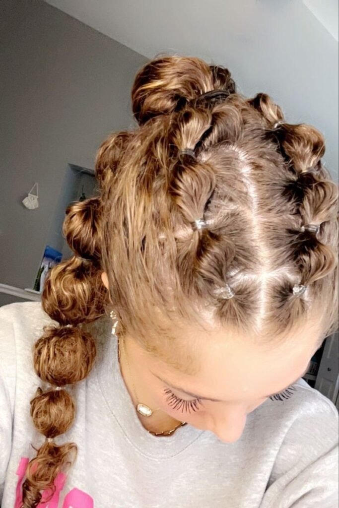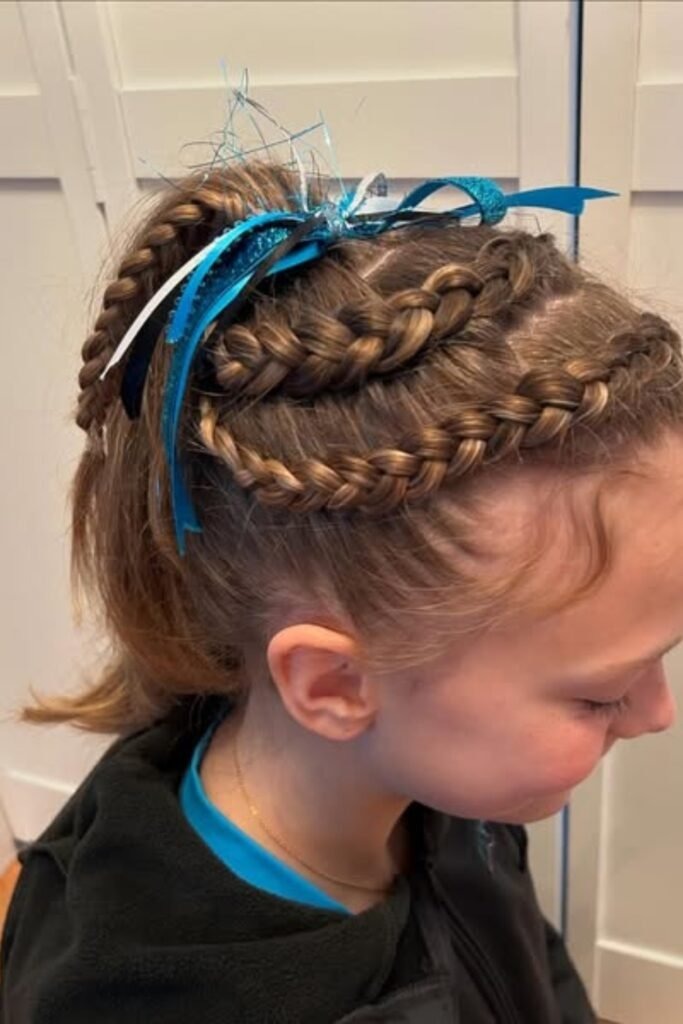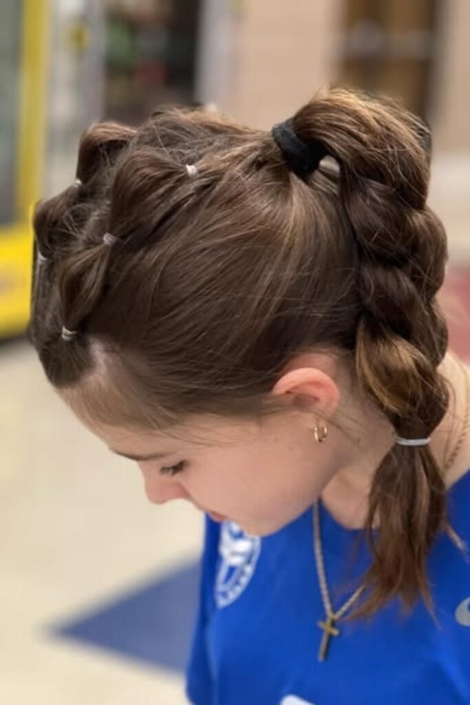 The Secure Bubble Pony combines a high ponytail with segmented “bubbles” along the length of the hair. Hair ties are spaced evenly down the ponytail to create the bubble effect. This style prevents the hair from bouncing too much during play and adds a visually striking look. It works for long hair and is versatile enough to pair with team colors or hair streaks.