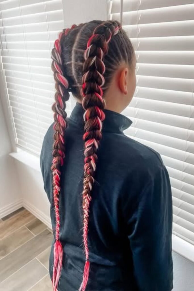 Double Dutch Braids with color streaks are a bold style for 2026. Hair is braided in two Dutch braids, with vibrant streaks woven into the braids for contrast. This style stays tight during play, reduces hair bouncing, and allows for creative expression through color. It is a popular choice for team photos and tournaments.