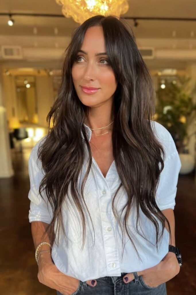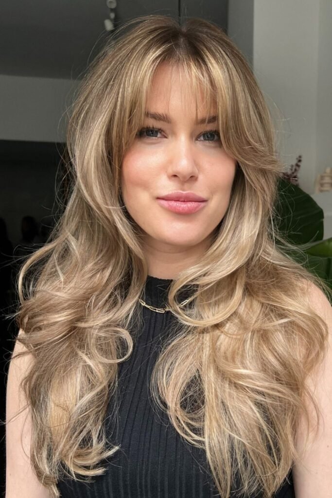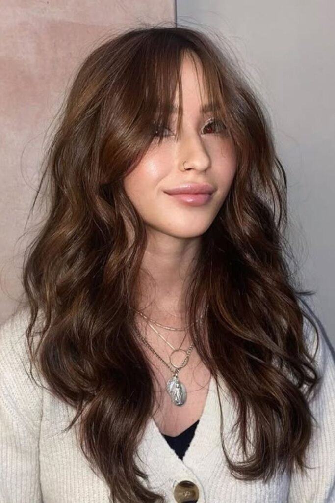 Long hair with waves gives the bangs something to blend into. This style looks best when air dried or lightly diffused. It feels easy and real.