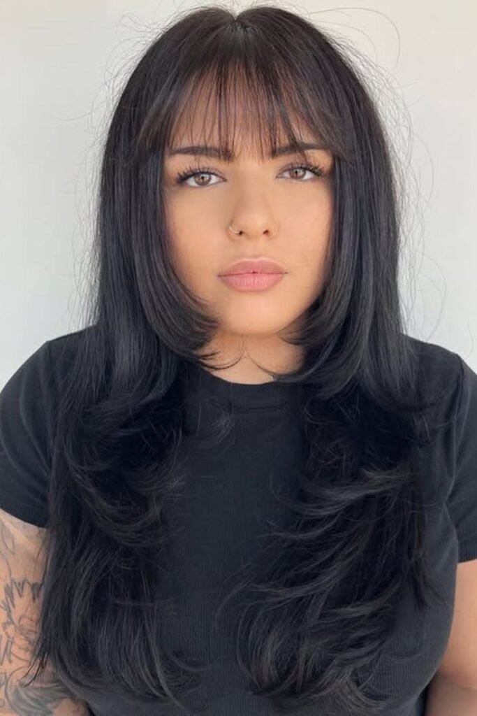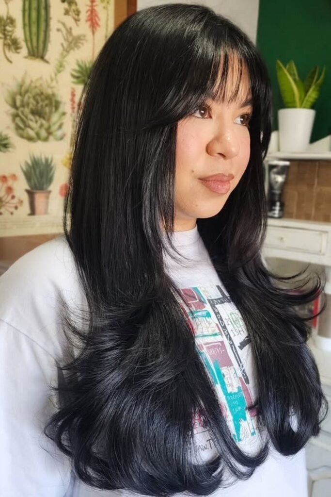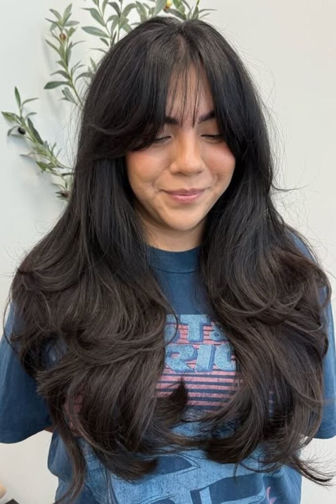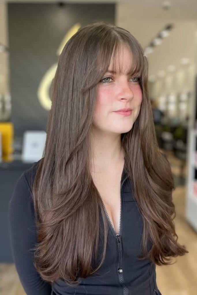 Feathered wisps are cut with soft strokes that taper at the ends. This style works best for people who want movement without bulk. The bangs fall lightly across the forehead and blend into long layers. They never look stiff because the ends are uneven on purpose.