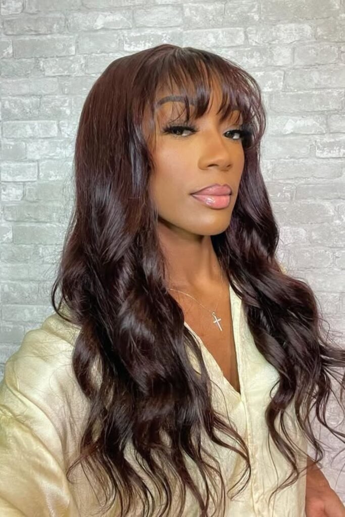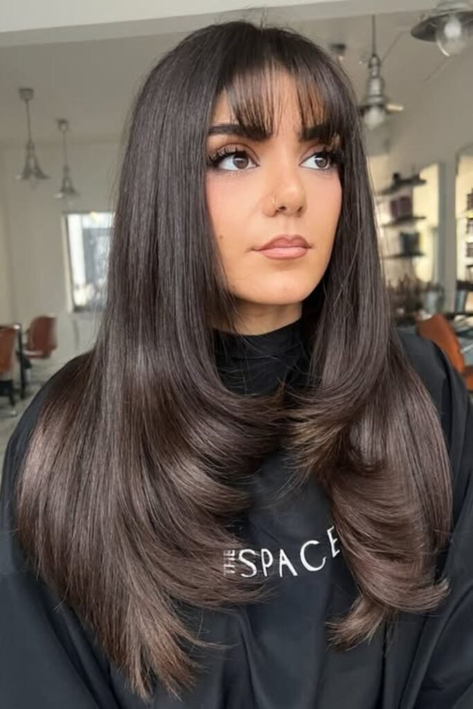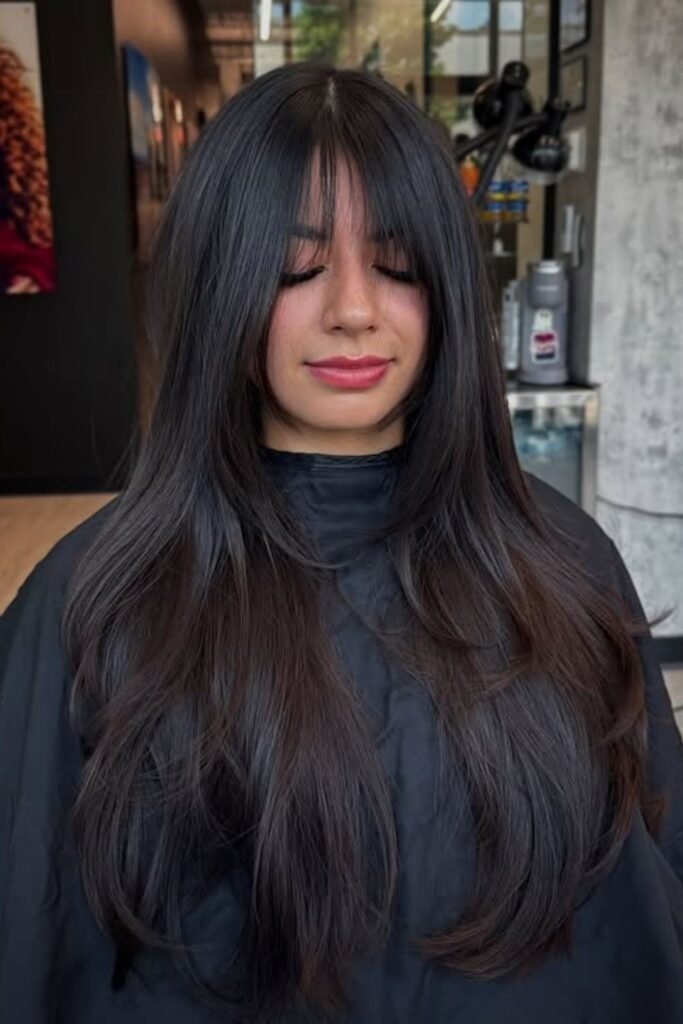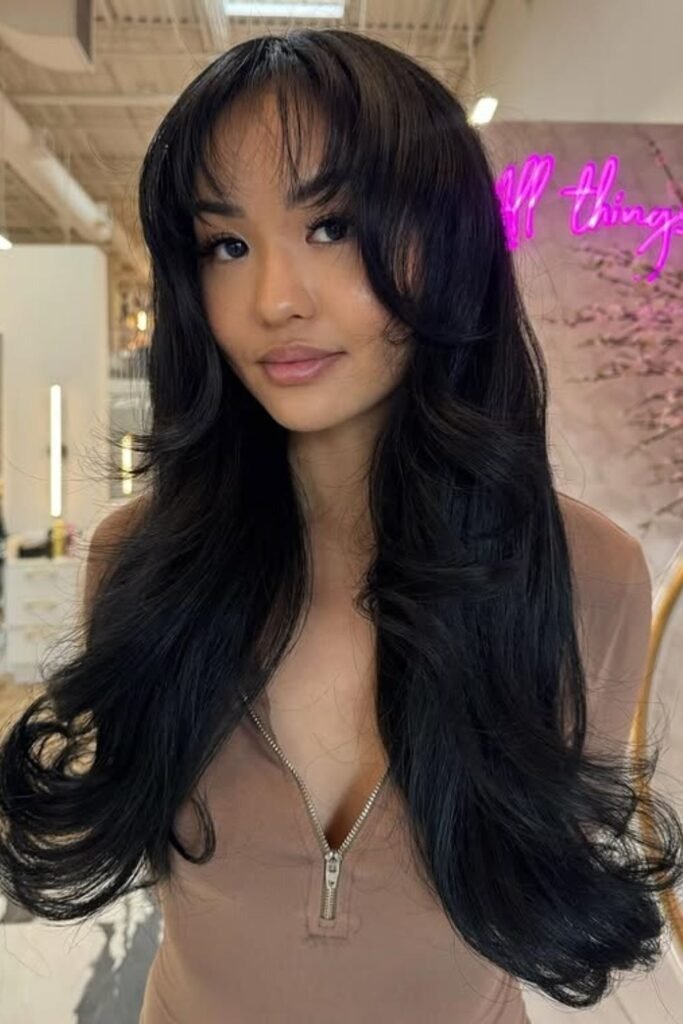 Long hair with soft glam bangs works well for events or daily wear. The key is light styling, not heavy hold.