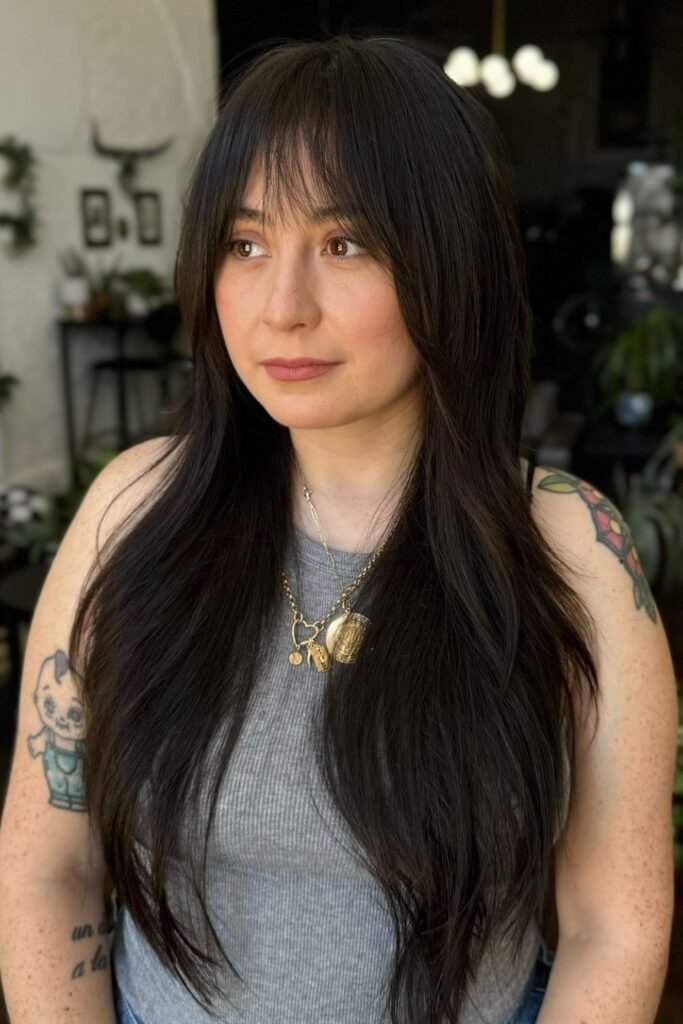 Long hair with a soft shag feels easy and lived in. Wispy bangs keep the face from getting lost in the layers. This style works well with waves and natural texture. It is ideal for people who want movement without sharp lines.