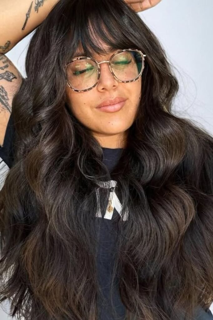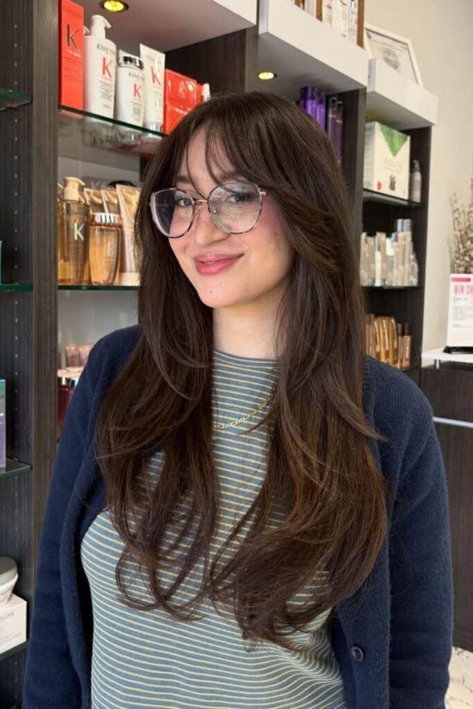 With long hair, this style keeps balance. The bangs stay soft even when glasses are worn all day. It is practical and stylish.