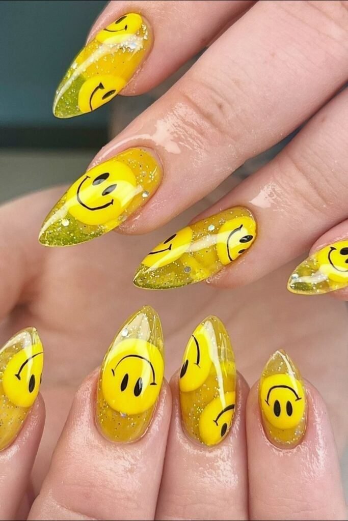 Smiley glitter nails mix soft yellow polish with small smiley faces or light glitter details. The key is keeping the design simple so it stays stylish.