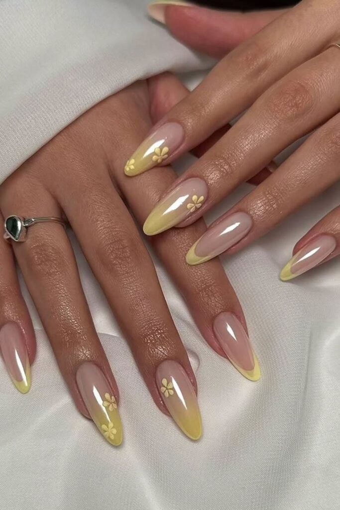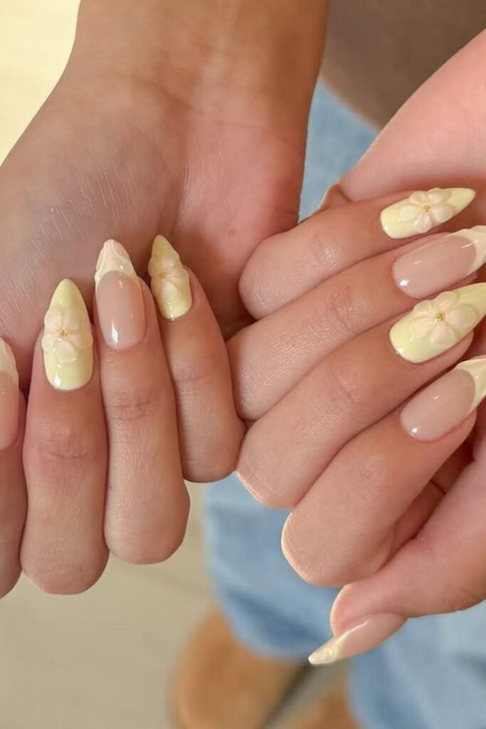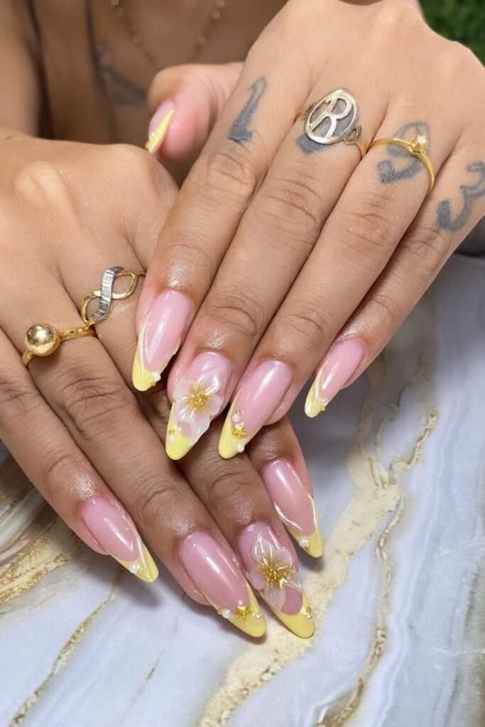 Floral French fade blends yellow into white at the tip with tiny floral details. The fade keeps the yellow soft, while flowers add interest.