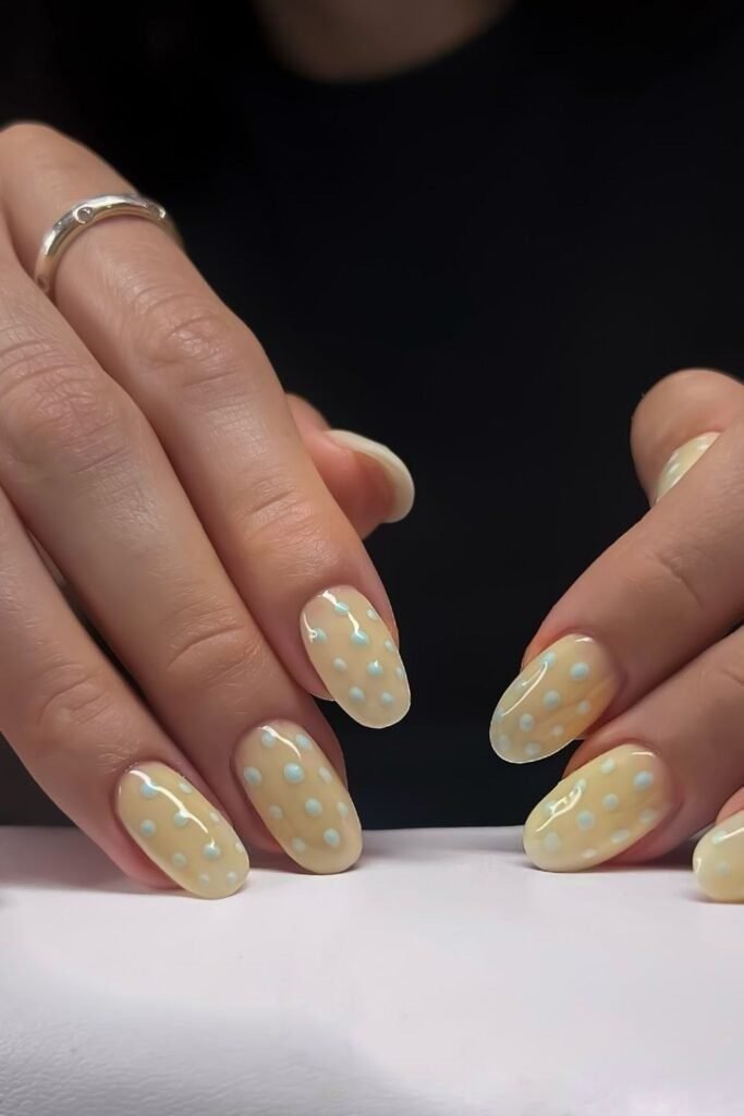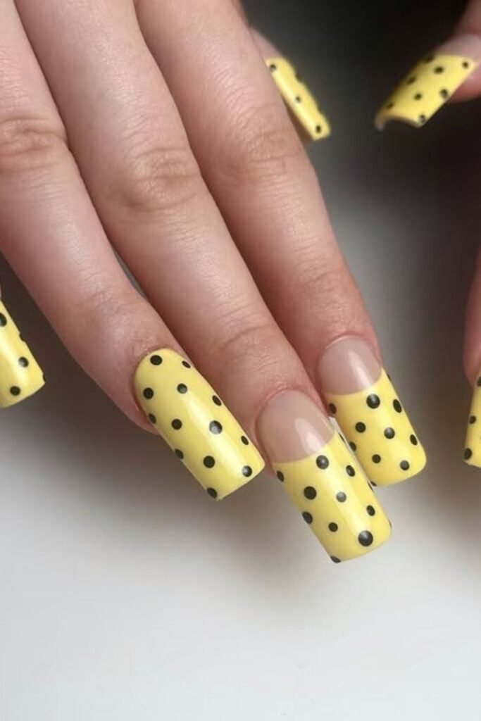 Retro polka tips use small dots in white or brown over yellow tips. The base stays nude, and the dots are evenly spaced.