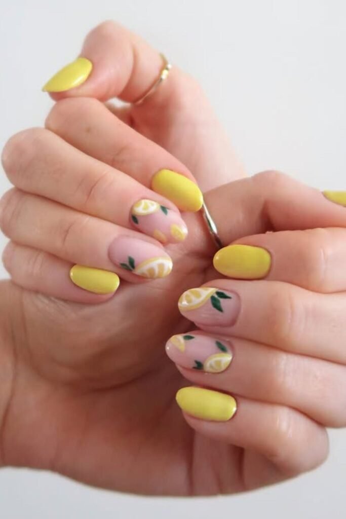 Lemon slice art shows small lemon pieces painted on accent nails. The rest of the nails stay plain yellow or nude to keep balance.