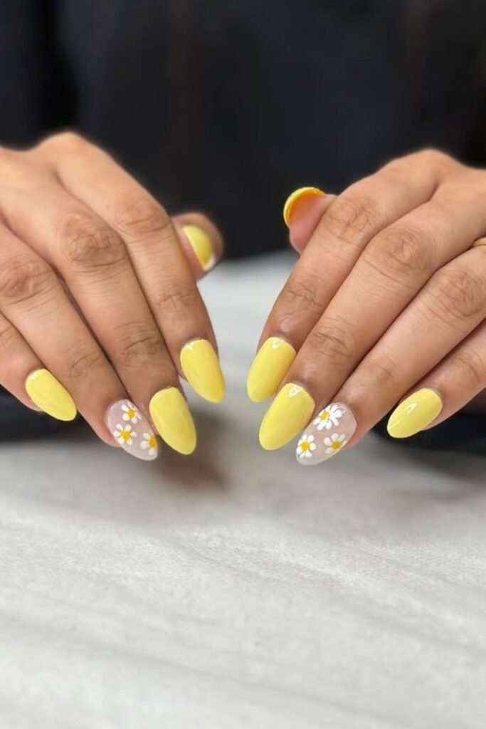 Daisy glow nails feature soft yellow bases with white daisies placed gently across the nail. The yellow is often sheer, giving a glowing effect.