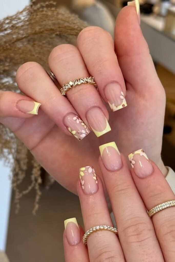 Pastel bloom French mixes soft yellow French tips with pastel flowers. The colors blend gently and feel calm.
