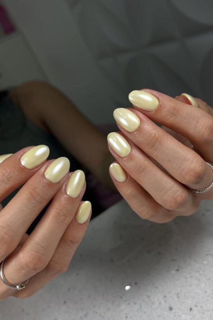 Pearl yellow glow uses a pearl finish over a soft yellow base. The shine is smooth, not glittery, giving a clean glow.