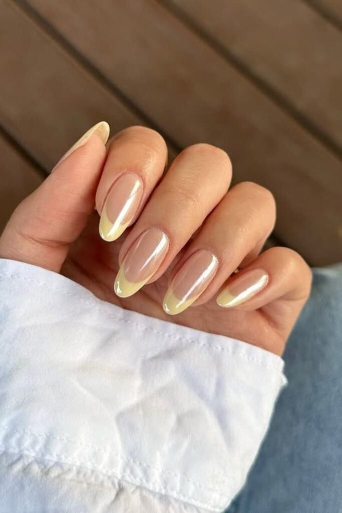 Soft yellow French replaces white tips with pale yellow. The base stays nude or pink, keeping the look classic.