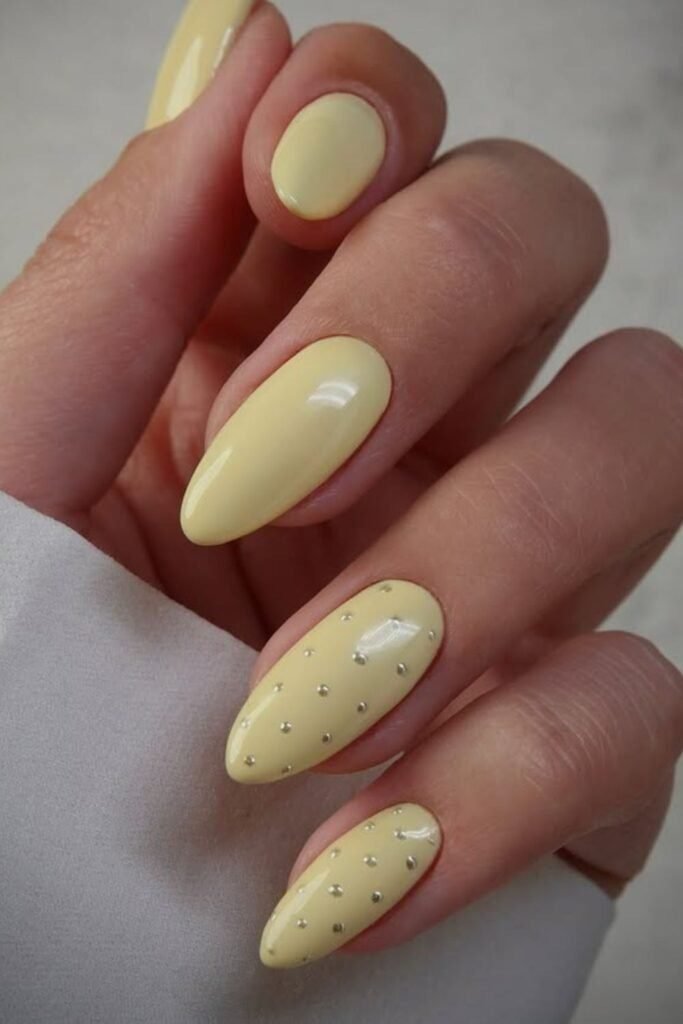 This idea fits casual wear and younger trends seen in 2026. It works best on short nails and pastel yellow shades. Too much glitter can overpower the look, so less is better.