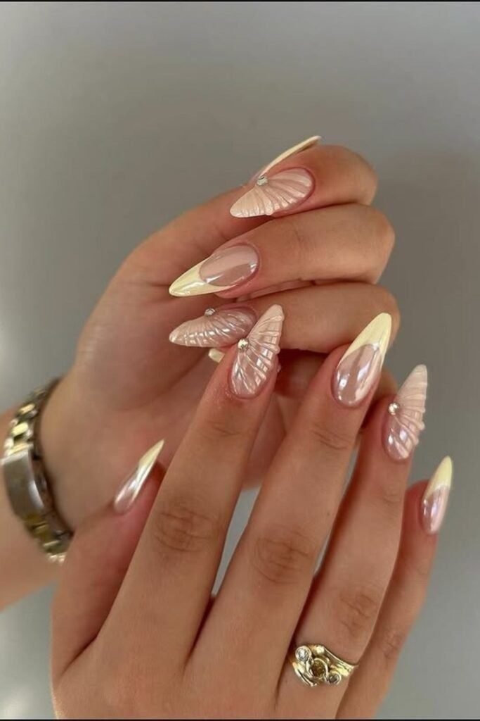 Shell French design uses shell-like curves in yellow at the tips. The lines are soft and layered.